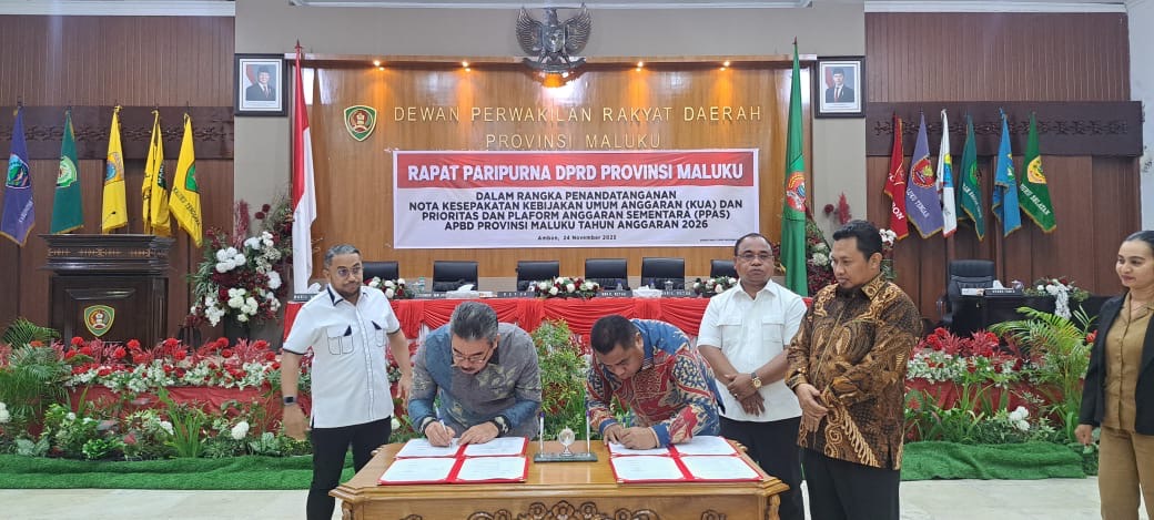 Penandatanganan nota kesepakatan ini berlangsung dalam Rapat Paripurna DPRD Provinsi Maluku, yang digelar di ruang rapat paripurna, kantor DPRD Provinsi Maluku, Senin (24/11/2025).
