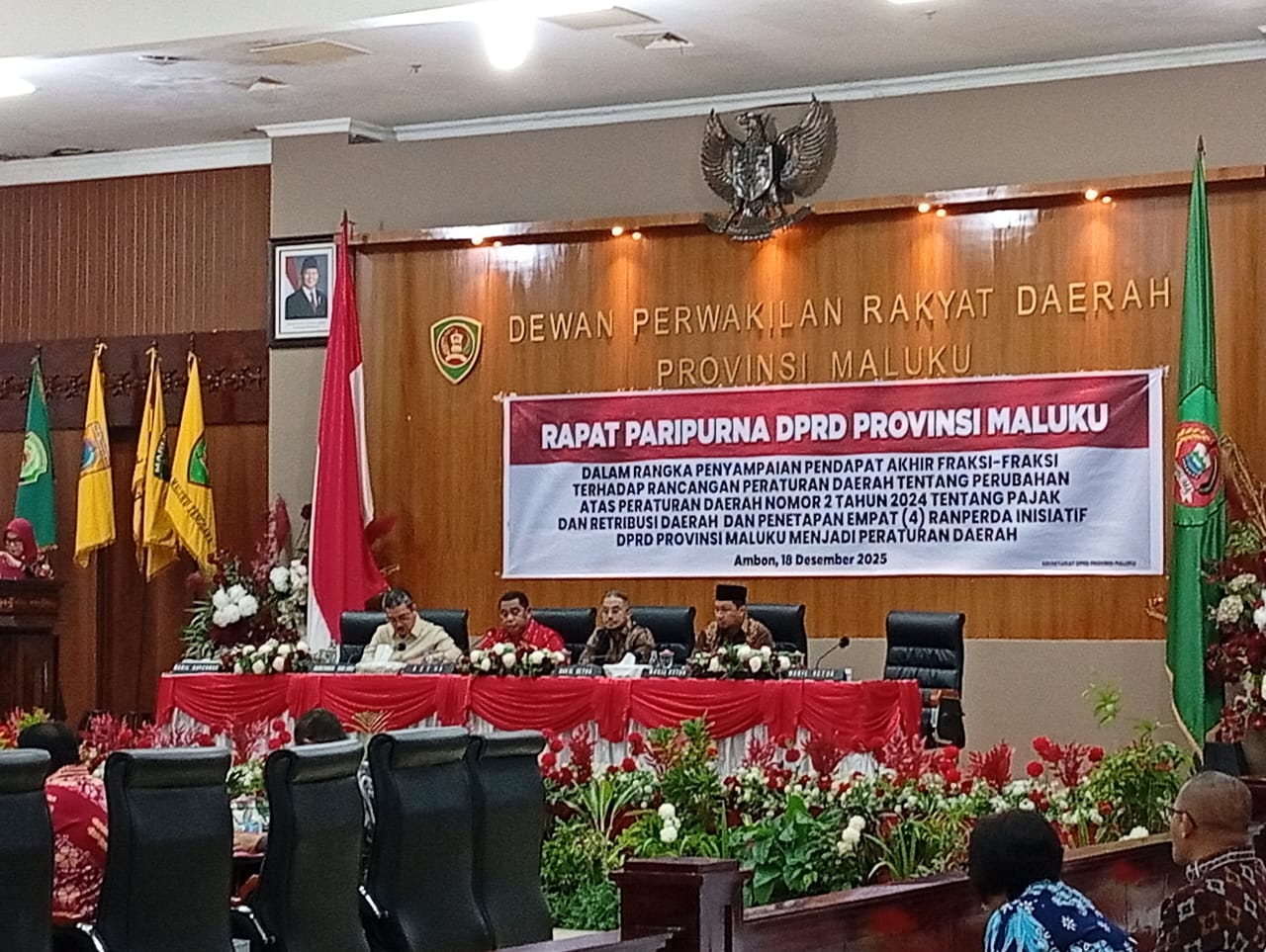 Hal itu disampaikan Andreas, saat rapat paripurna DPRD Provinsi Maluku, dalam rangka penyampaian pendapat akhir fraksi-fraksi terhadap Ranperda tentang perubahan atas Peraturan Daerah (Perda) Nomor 2 tahun 2024 tentang Pajak dan Retribusi Daerah Maluku, dan penetapan empat buah Ranperda Inisiatif DPRD Provinsi Maluku menjadi Perda, yang berlangsung di ruang rapat paripurna, Kamis (18/12/2025).
