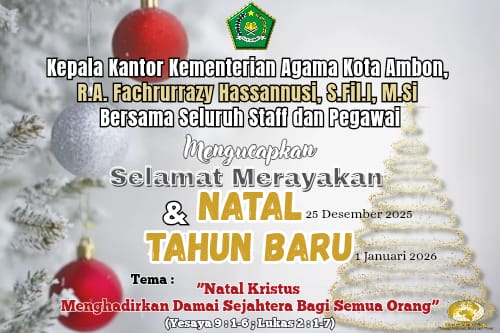 Ambon,CahayaMediaTimur.com-Kepala Kantor Kementerian Agama Kota Ambon, R.A.Fachrurrasy Hassanusi,s.Fil.l, M.Si, bersama seluruh staf dan pegawai mengucapkan selamat Natal 25 Desember 2025 Dan Tahun Baru 1 Januari 2026