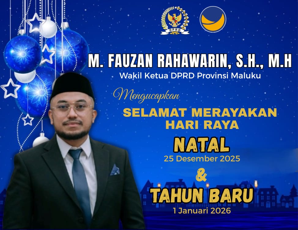 Ambon,CahayaMediaTimur.com-Iklan Ucapan Selamat Merayakan Natal 25 Desember 2025 dan Tahun Baru 1 Januari 2026.Bpk Fauzan Rahawarin,SH.,M.H.Wakil Ketua DPRD Provinsi Maluku