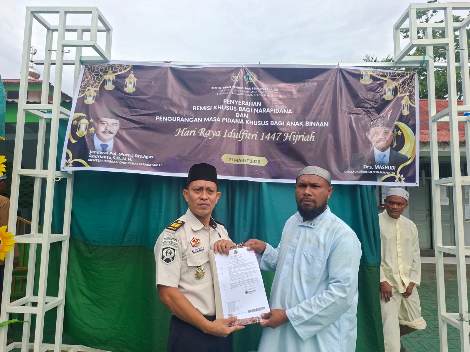 Langgur,CahayaMediaTimur.com-Gema takbir yang berkumandang di Lembaga Pemasyarakatan (Lapas) Kelas IIB Tual, Kantor Wilayah Ditjenpas Maluku membawa kebahagiaan tersendiri bagi puluhan Warga Binaan Pemasyarakatan (WBP). Tepat pada perayaan Hari Raya Idul Fitri 1 Syawal 1447 Hijriah, Sabtu (21/3/2026), sebanyak 31 warga binaan resmi menerima Remisi Khusus (RK) sebagai bentuk apresiasi atas perubahan perilaku dan ketaatan mereka selama menjalani masa pidana.
