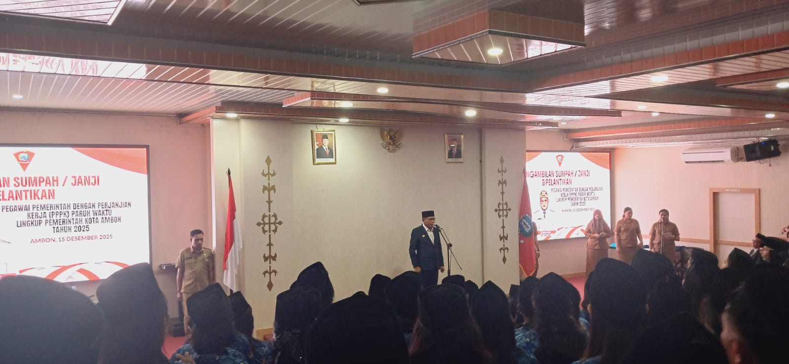 Ambon,CahayaMediaTimur.com-Wali Kota Ambon Bodewin Wattimena resmi melantik 170 Pegawai Pemerintah dengan Perjanjian Kerja (PPPK) Paruh Waktu di Ruang Vlissingen, Balai Kota Ambon, Senin (15/12/2025). Pelantikan ini menjadi bagian dari kebijakan pemerintah pusat dan daerah untuk menyelesaikan persoalan tenaga honorer secara bertahap di lingkungan Pemerintah Kota Ambon.