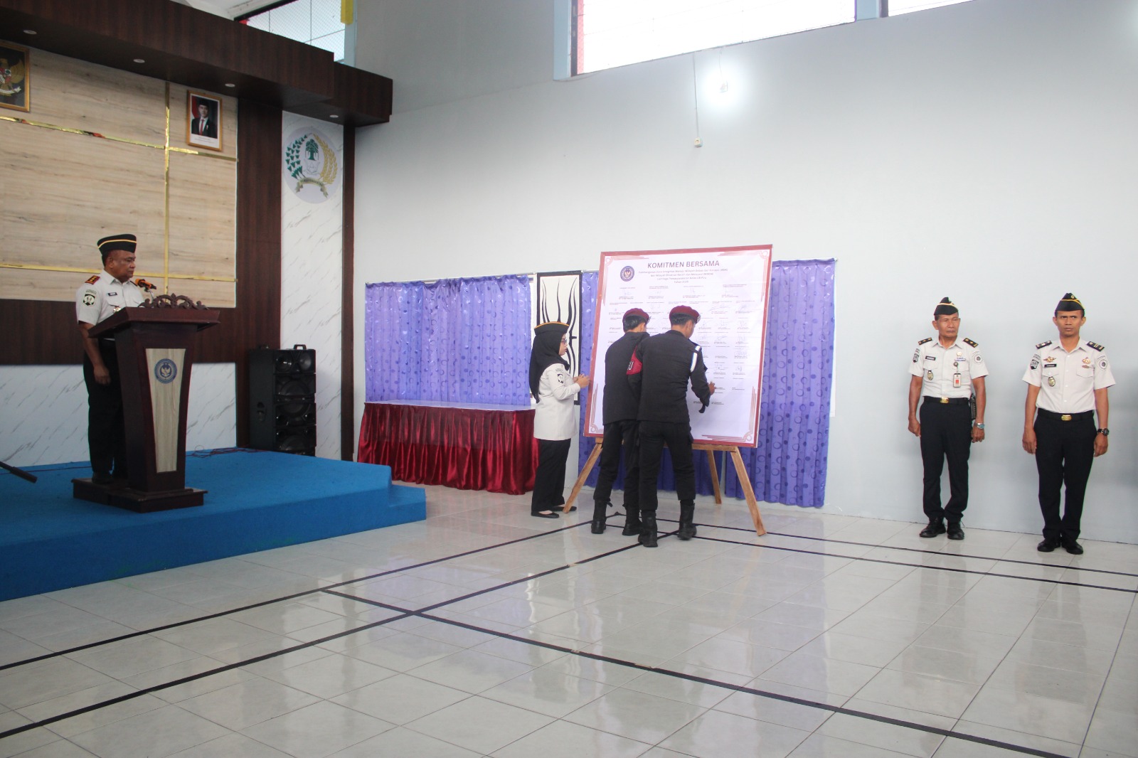 Penandatanganan komitmen bersama tersebut diikuti oleh Kepala Lapas Kelas IIB Piru, Hery Kusbandono, beserta seluruh jajaran pejabat struktural, staf, dan petugas pengamanan. Kegiatan ini menjadi simbol tanggung jawab bersama seluruh unsur pegawai dalam membangun budaya kerja yang profesional, berintegritas, dan berorientasi pada pelayanan publik yang prima.