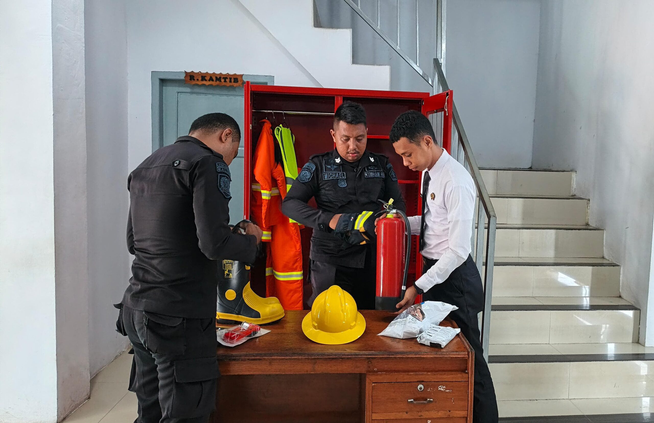 Selanjutnya, petugas melaksanakan pengecekan kualitas alat pemadam api ringan (APAR), meliputi pemeriksaan tekanan tabung, kondisi selang, pin pengaman, serta masa kedaluwarsa media pemadam. Selain APAR, peralatan pendukung lainnya seperti kapak pemadam dan pakaian pemadam kebakaran turut diperiksa kelayakannya, mulai dari kekuatan gagang, ketajaman mata kapak, hingga kondisi bahan dan kelengkapan pelindung pada pakaian pemadam.