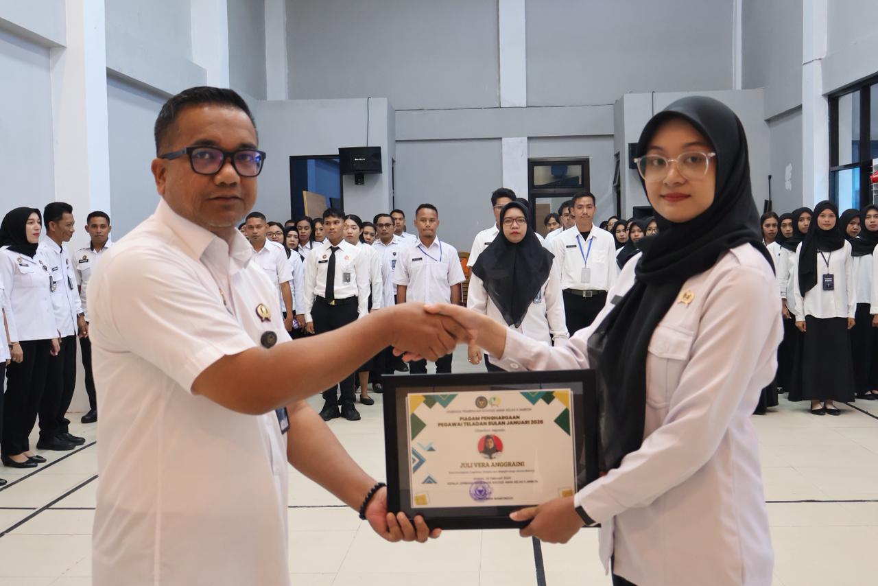 Ambon,CahayaMediaTimur.com-Lembaga Pembinaan Khusus Anak (LPKA) Kelas II Ambon memberikan penghargaan Pegawai Teladan kepada Juli Vera Anggraini dalam pelaksanaan Apel Pagi Pegawai Staf dan Peserta Magang yang digelar di Gedung Serbaguna LPKA Kelas II Ambon, Rabu (11/2). Pemberian penghargaan ini merupakan bentuk apresiasi pimpinan atas dedikasi, loyalitas, dan kinerja pegawai dalam mendukung pelaksanaan tugas dan fungsi pemasyarakatan.