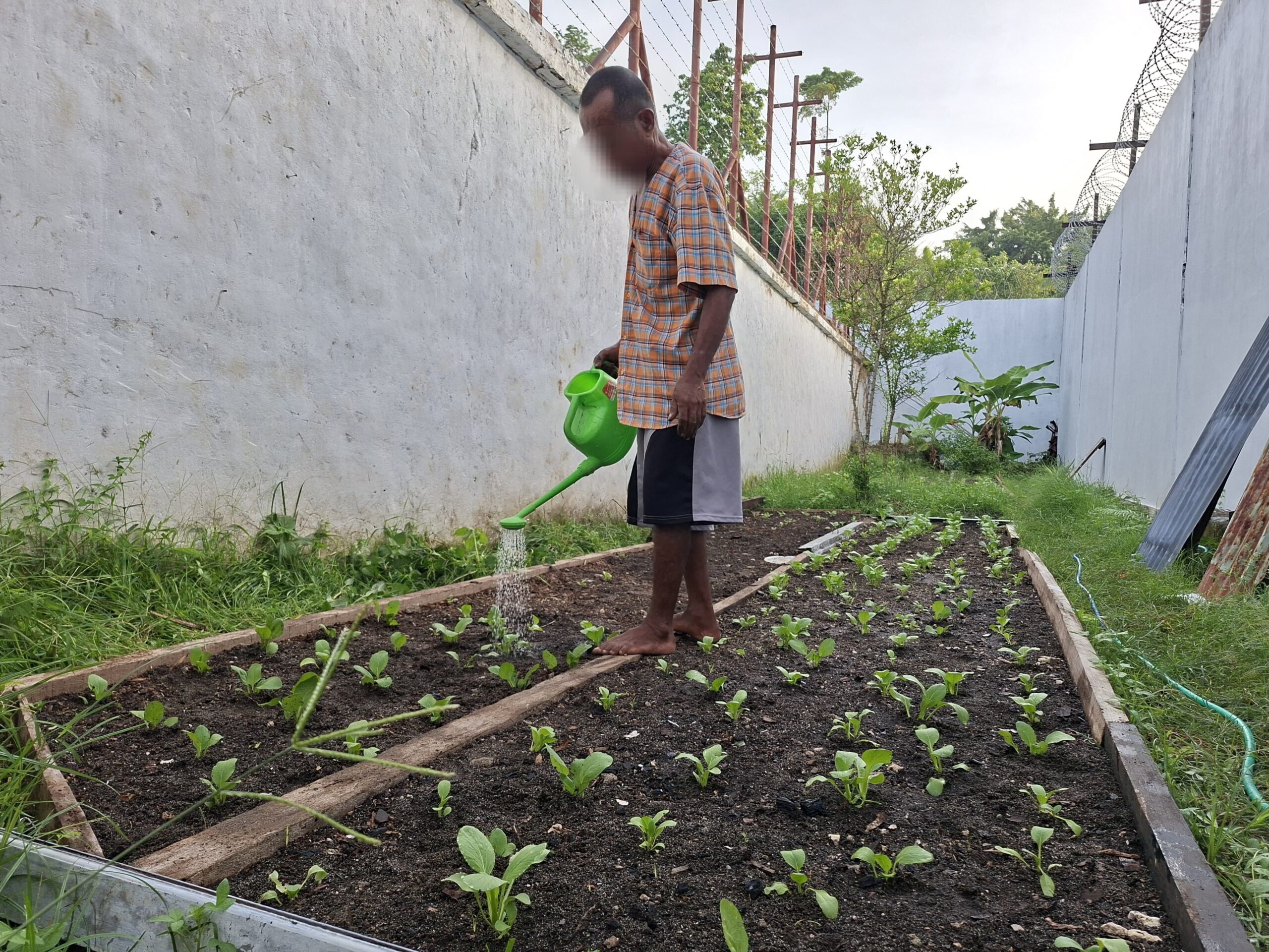 Kegiatan perawatan kebun difokuskan pada tanaman sawi putih yang saat ini sedang dibudidayakan. Dalam pelaksanaannya, warga binaan membersihkan rumput liar yang tumbuh di sekitar tanaman serta melakukan penyiraman guna menjaga kondisi tanah dan mendukung pertumbuhan tanaman agar tetap optimal.