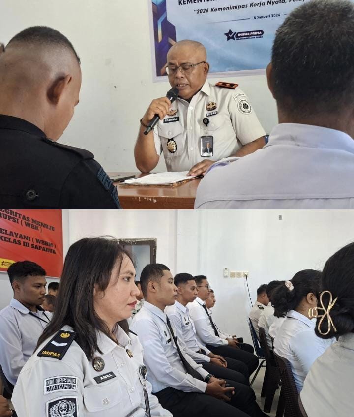 Saparua,CahayaMediaTimur.com-Kanwil Ditjenpas Maluku, Lembaga Pemasyarakatan Kelas III Saparua melaksanakan rapat dinas perdana Tahun 2026 yang dipimpin langsung oleh Kepala Lapas Saparua, Pramuaji Buamonabot. Kegiatan yang berlangsung di Aula Kantor Lapas Saparua ini dihadiri oleh jajaran pimpinan, staf pegawai, CPNS, peserta magang Kementerian Ketenagakerjaan Batch II Tahun 2025, serta petugas pengamanan sebagai langkah awal menyatukan persepsi dan memperkuat komitmen pelaksanaan tugas pemasyarakatan di tahun berjalan, Senin (26/01).