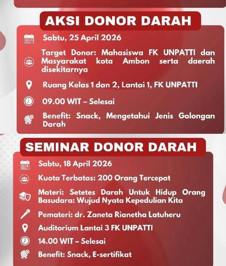 “Seminar donor darah akan dilakukan pada Sabtu,(18/4/2026) pukul, 14.00 WIT – selesai di ruang Auditorium, Lantai 3 FK Unpatti, dan sebagai pembicara dr. Zaneta Rianetha Latuheru.