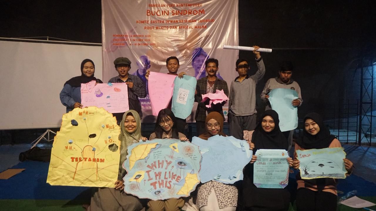 Sidoarjo,CahayaMediaTimur.com-CahayaMahasiswa Kuliah Kerja Nyata (KKN) Universitas Muhammadiyah Sidoarjo (UMSIDA) bekerja sama dengan Komite Sastra Dewan Kesenian Sidoarjo untuk mengorganisir Workshop Puisi Kontemporer yang berlangsung pukul 15.00 hingga 18.00 WIB, bertempat di Dewan Kesenian Sidoarjo. Acara ini adalah bagian dari rangkaian pameran “Bucin Sindrom” yang tidak hanya menampilkan karya visual, tetapi juga memberikan ruang untuk literasi yang aktif dan partisipatif.